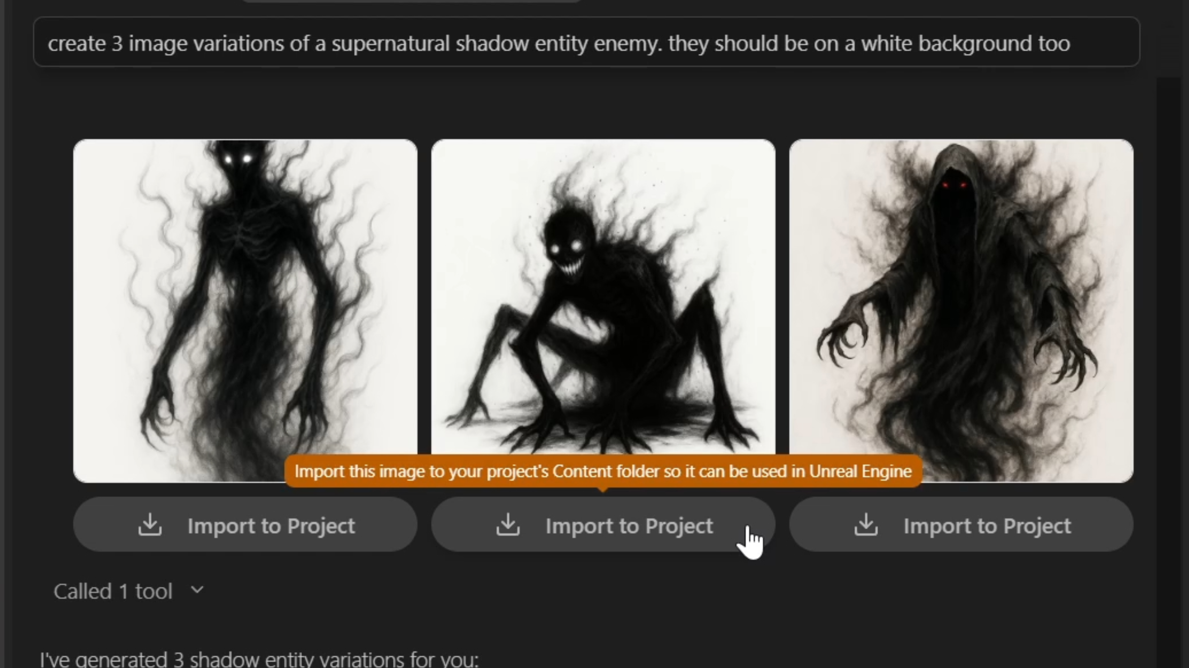 “Create 3 image variations of a supernatural shadow entity enemy. They should be on a white background too”