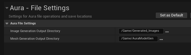 Generated materials are saved to the directory set in Edit > Editor Preferences > Aura > File Settings > Material Generation Output Directory.