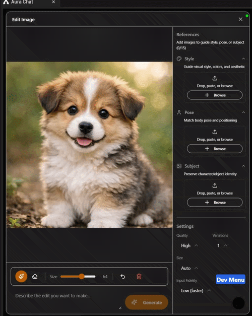 💡 Since Aura is aware of all the images in a thread, when editing an image in a thread with many images, it’s useful to tell Aura specifically which image it should edit. i.e. “Edit the image of the dog wearing a tophat by adding a monocle and a bowtie”