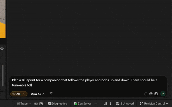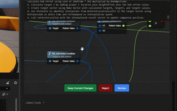 - Prompt Aura, for example: “Create a companion blueprint that follows the player and bobs up and down. There should be a tune-able follow speed and stopping distance so the player and companion never overlap.”