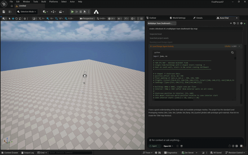 Aura can generate full 3D level blockouts from natural language descriptions. Describe the space you want and Aura will build the geometry directly in your level using the new Level Design Agent. It can also populate your levels with scattered assets using PCG.